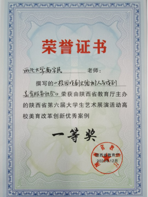 此次活动中,我院高字民老师《校园戏剧立德树人与戏剧美育服务社会》荣获陕西第六届大学生艺术展演活动高校美育改革创新优秀案例一等奖,并被作为优秀案例推荐教育部。(网页链接 http://jyt.shaanxi.gov.cn/news/gsgg/202012/18/17871.html